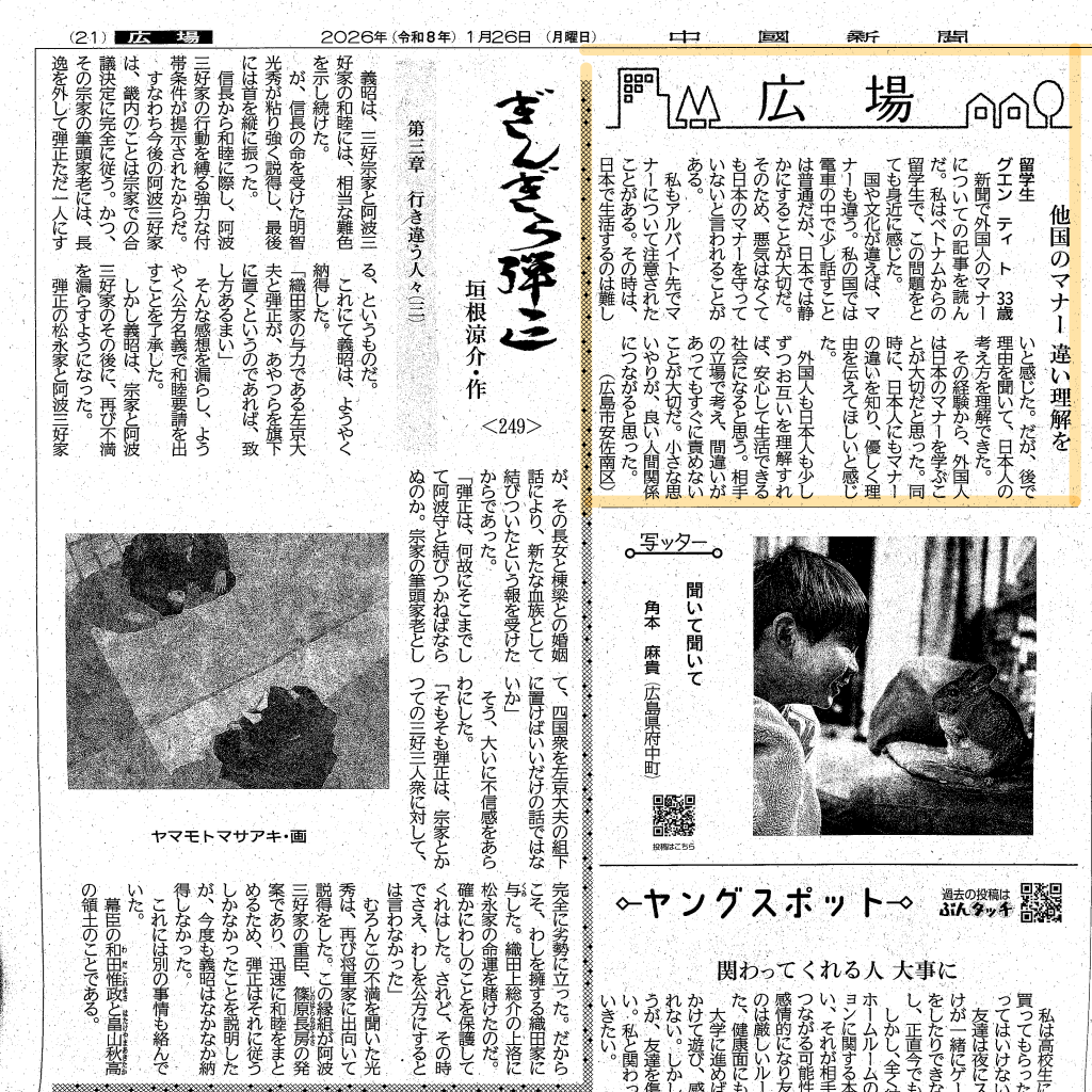 1月26日(月)付の中国新聞の広場欄に掲載されました。